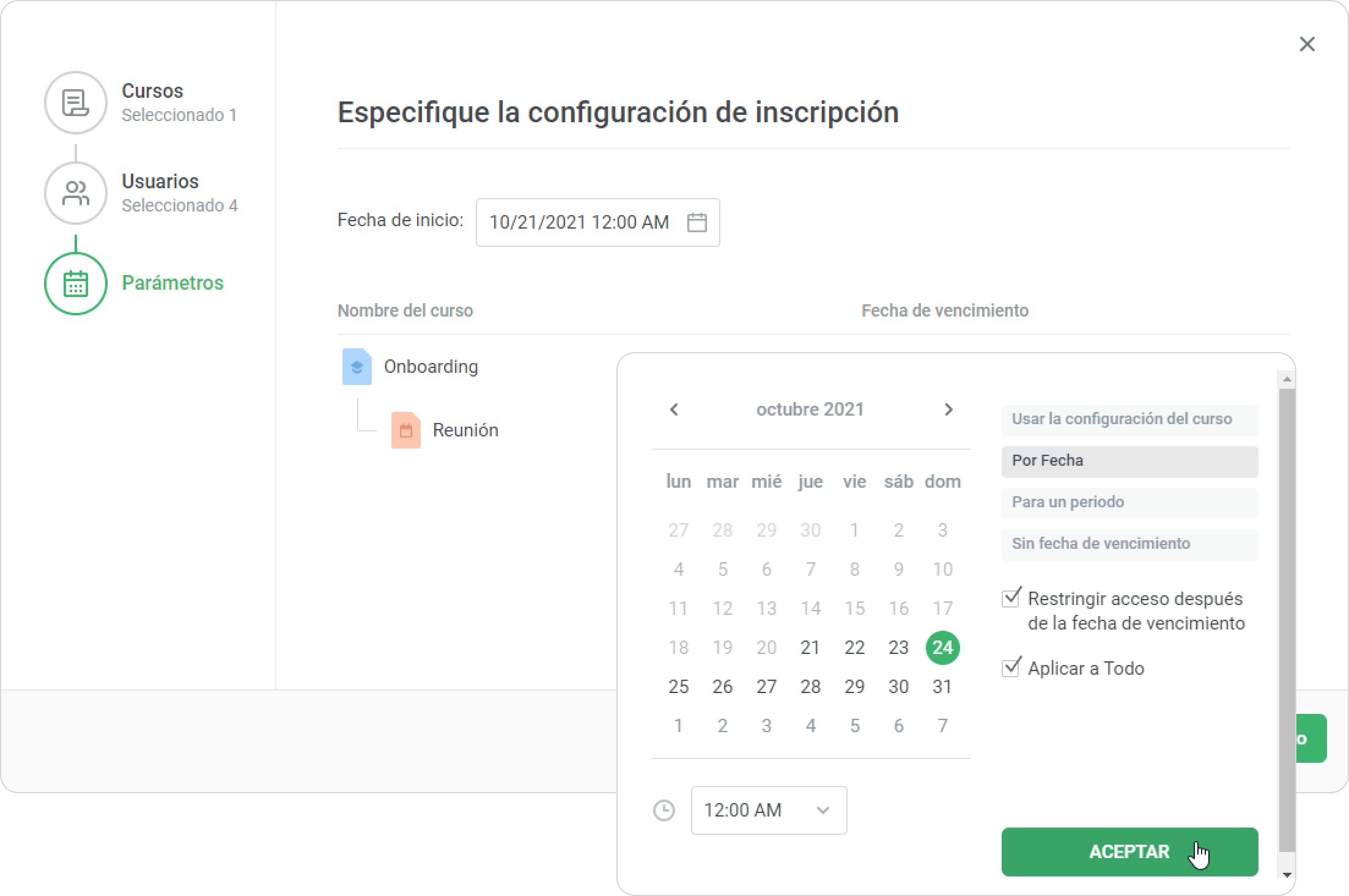 En este paso, puede configurar la fecha y hora de inicio para empezar a estudiar el contenido, especificar la fecha de finalización, seleccionar una sesión de formación si el curso incluye formación o permitir que los alumnos elijan una sesión por su cuenta.