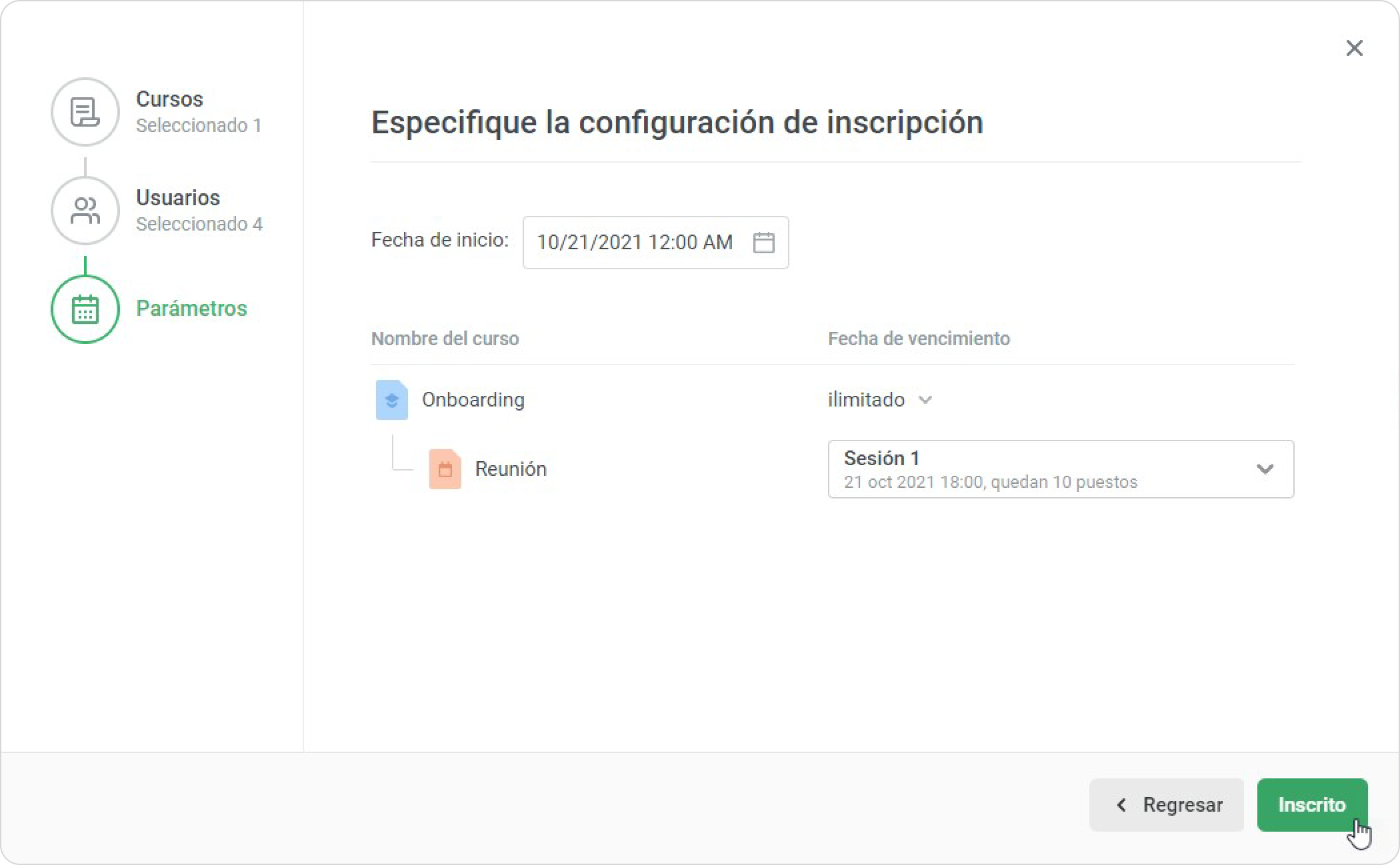 - La cuarta opción es asignar un curso en la página de un usuario. En este caso, el orden de las etapas de la inscripción será diferente.