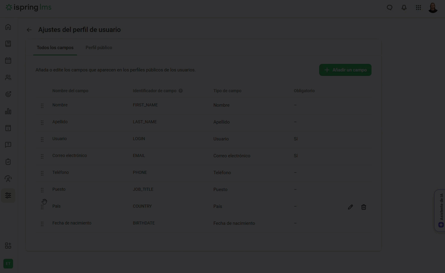 Para cambiar el orden de los campos de la cuenta de usuario, arrastra y suelta el nombre del campo.