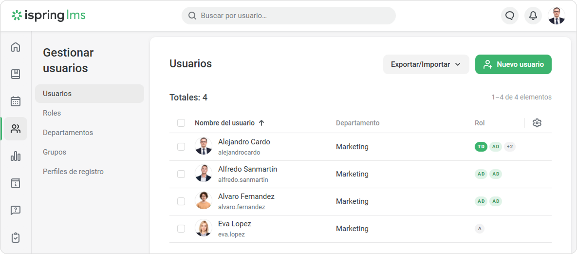 - Cuando un usuario con el rol de Administrador del sistema inicia sesión en la cuenta, solo verá una lista de usuarios que pertenecen a su departamento, así como la opción de mensajes, que es necesaria para chatear con ellos.