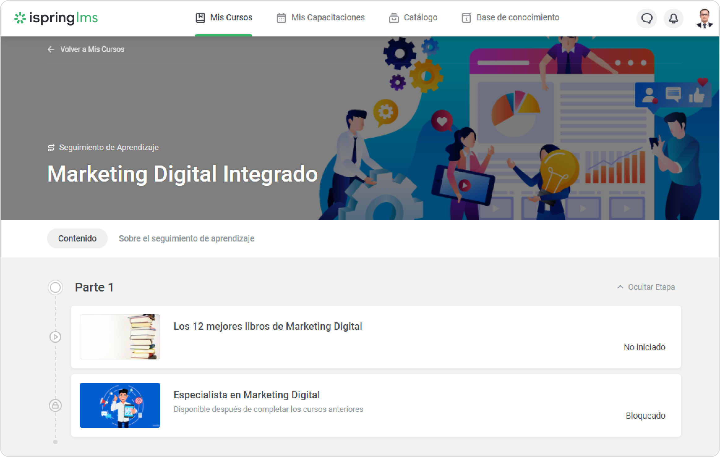 Normalmente, un curso en un LMS ya incluye varios elementos de contenido (módulos), por ejemplo, una guía en PDF, un archivo SCORM, y una evaluación. La ruta de aprendizaje le permite combinar varios cursos en un plan de estudios a largo plazo.