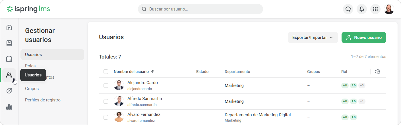 Puede encontrar todos los ajustes relacionados con la gestión de usuarios en la sección Usuarios del portal del administrador. Aquí puede gestionar las listas de usuarios, los grupos, los roles del usuario y los departamentos.