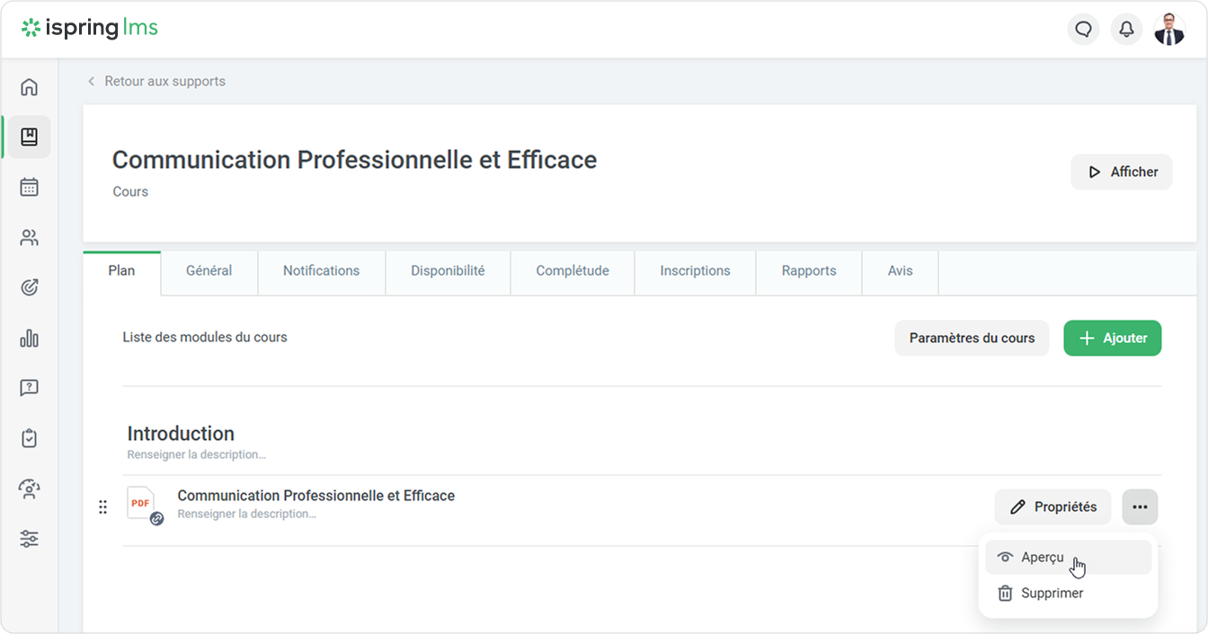 Pour afficher un élément de contenu, cliquez sur le menu et sélectionnez Aperçu.