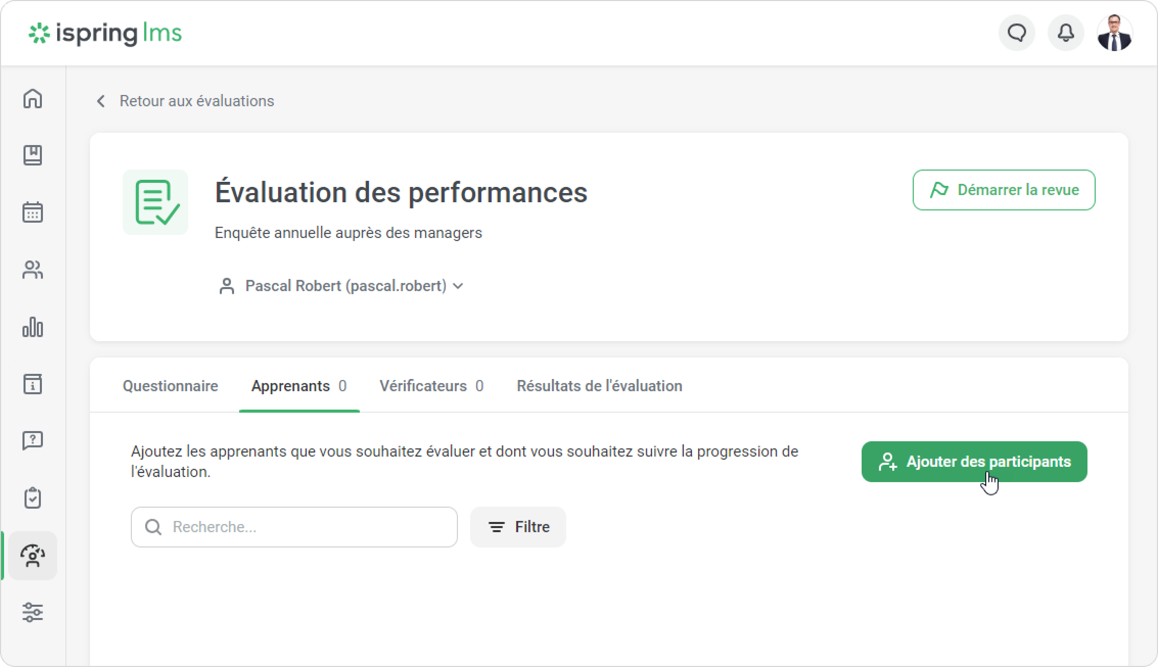 - Pour sélectionner un employé, cliquez sur Ajouter des participants dans la section Apprenants.