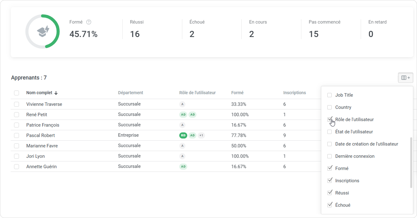 Dans l'exemple ci-dessous, nous ajoutons la colonne Rôle de l'utilisateur et supprimons la colonne Terminé dans le rapport de progression de l'apprenant. Les résultats du rapport sont immédiatement mis à jour.