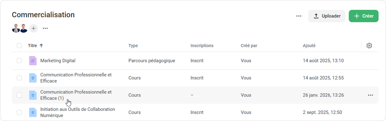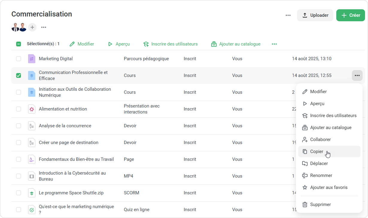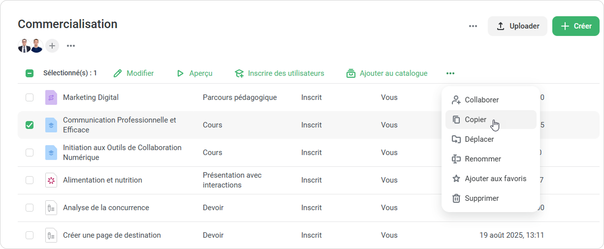 S'il y a déjà un cours portant le même nom dans le dossier de destination, renommez-le ou annulez la copie. Le cours est copié dans le dossier de destination.