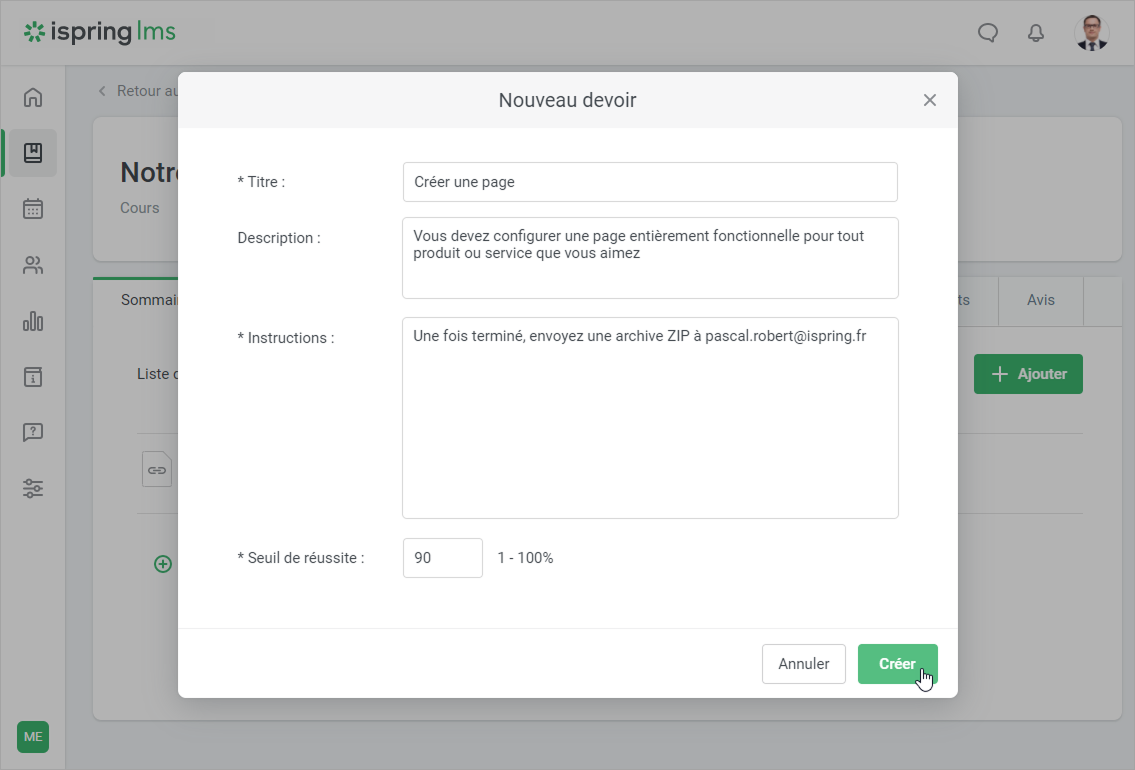- Dans la fenêtre Nouveau devoir, ajoutez le titre, la description et les instructions du devoir et définissez la note de passage. Cliquez sur le bouton Créer.