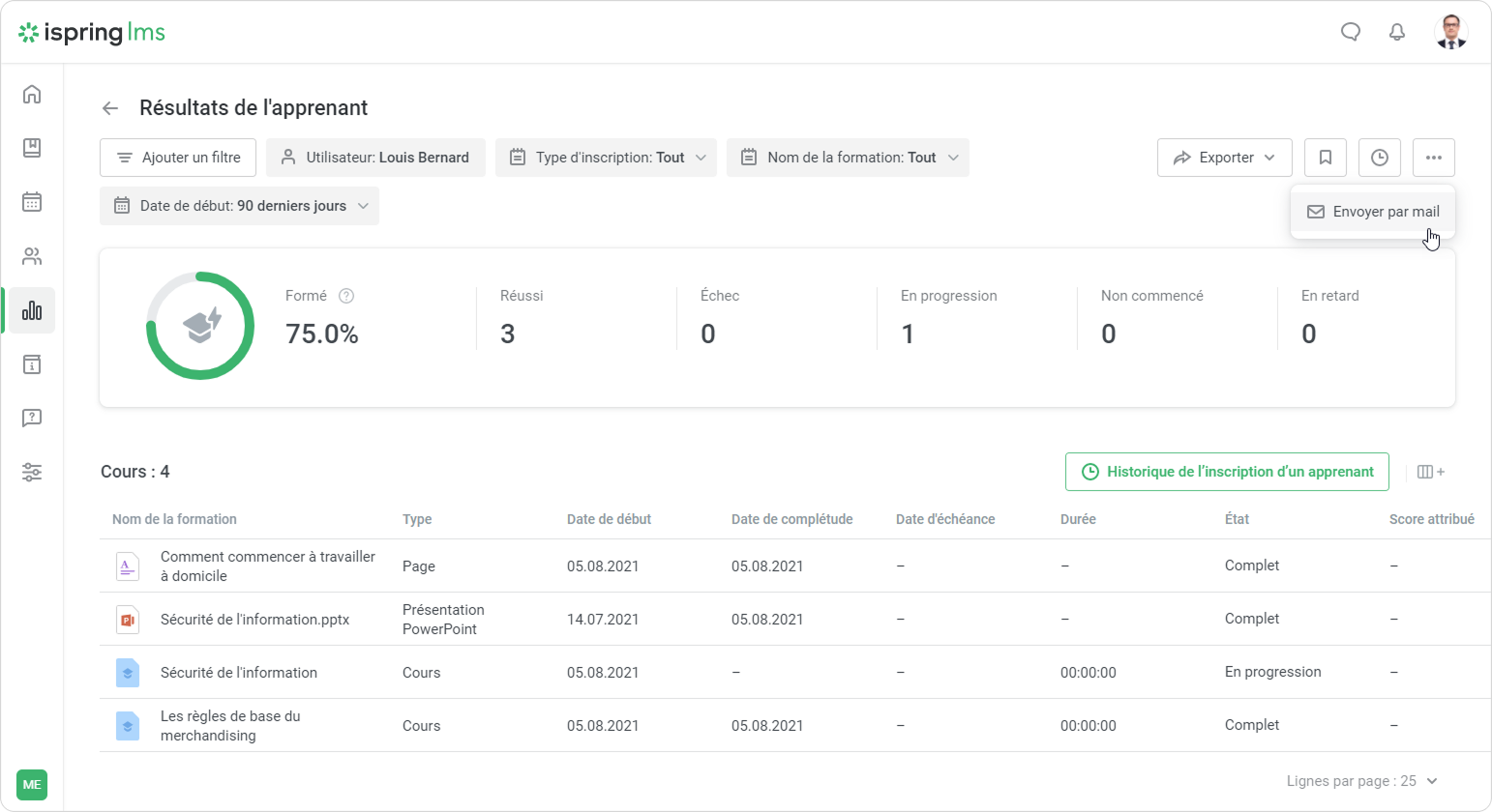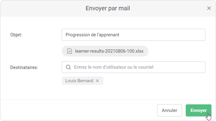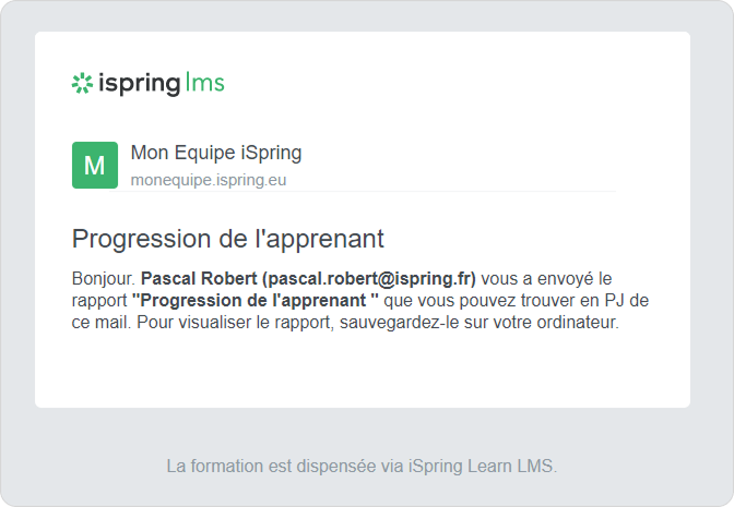 Envoyez un rapport aux emails de vos collègues ou employés pour montrer la progression des apprenants dans un cours ou fournir des informations sur la participation aux formations.