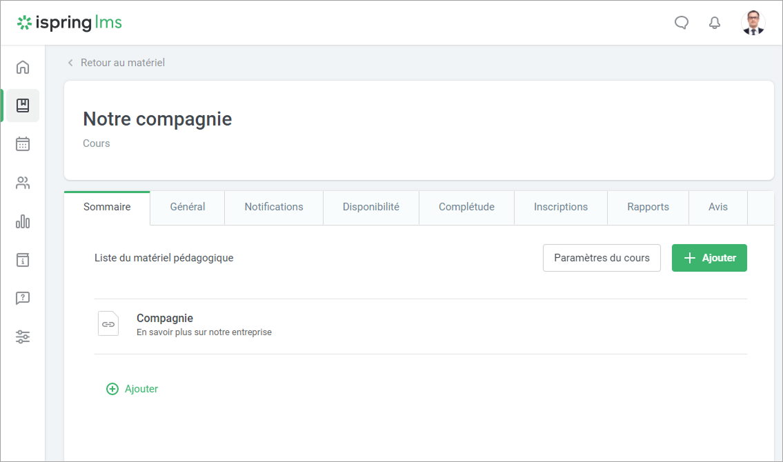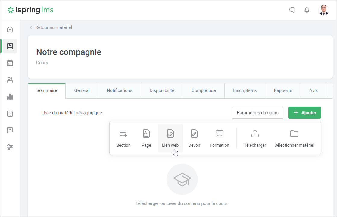 - Ouvrez votre cours, sélectionnez l'onglet Sommaire, cliquez sur Ajouter et choisissez Lien web.