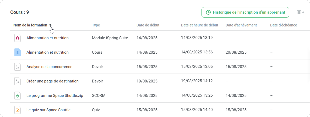 Par exemple, trions les résultats du rapport par la colonne Nom du la formation. En fonction du sens de la flèche, les cours seront affichés dans l'ordre alphabétique ou inversement.