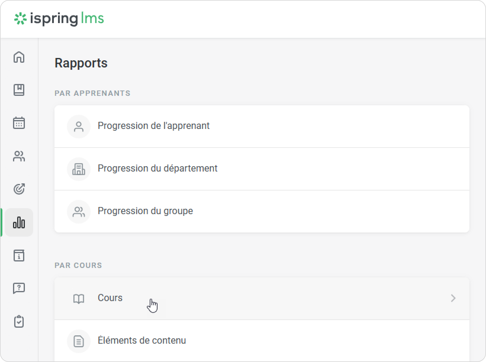 - Ouvrez la section Rapports, cliquez sur Cours, et le rapport s'ouvrira sur la même page.