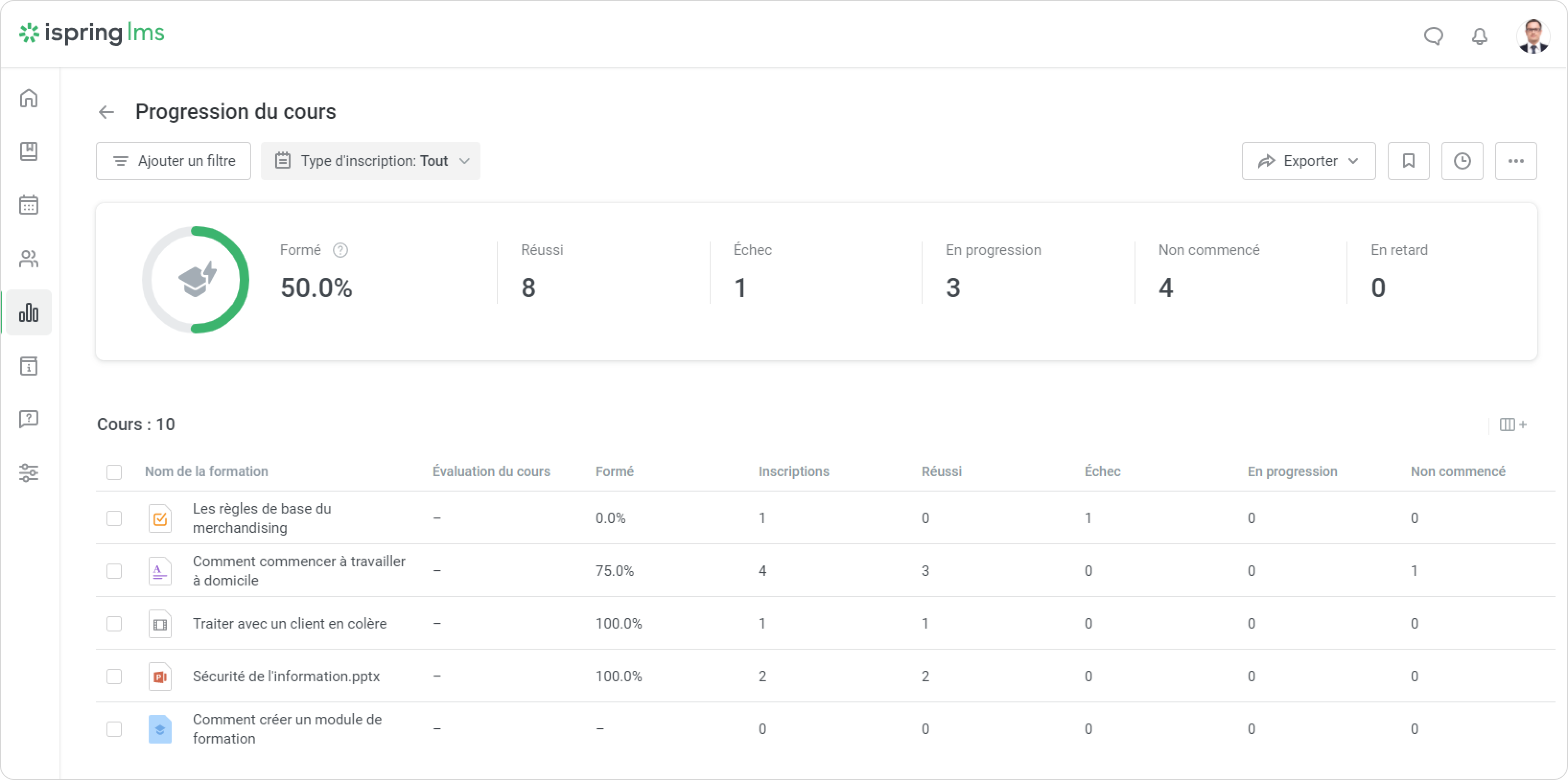 Le nouveau rapport sur la progression des cours est une option pratique pour vérifier la progression des apprenants sur un ou plusieurs cours. Vous pouvez également vérifier les statuts des cours qui ont déjà été attribués aux utilisateurs.