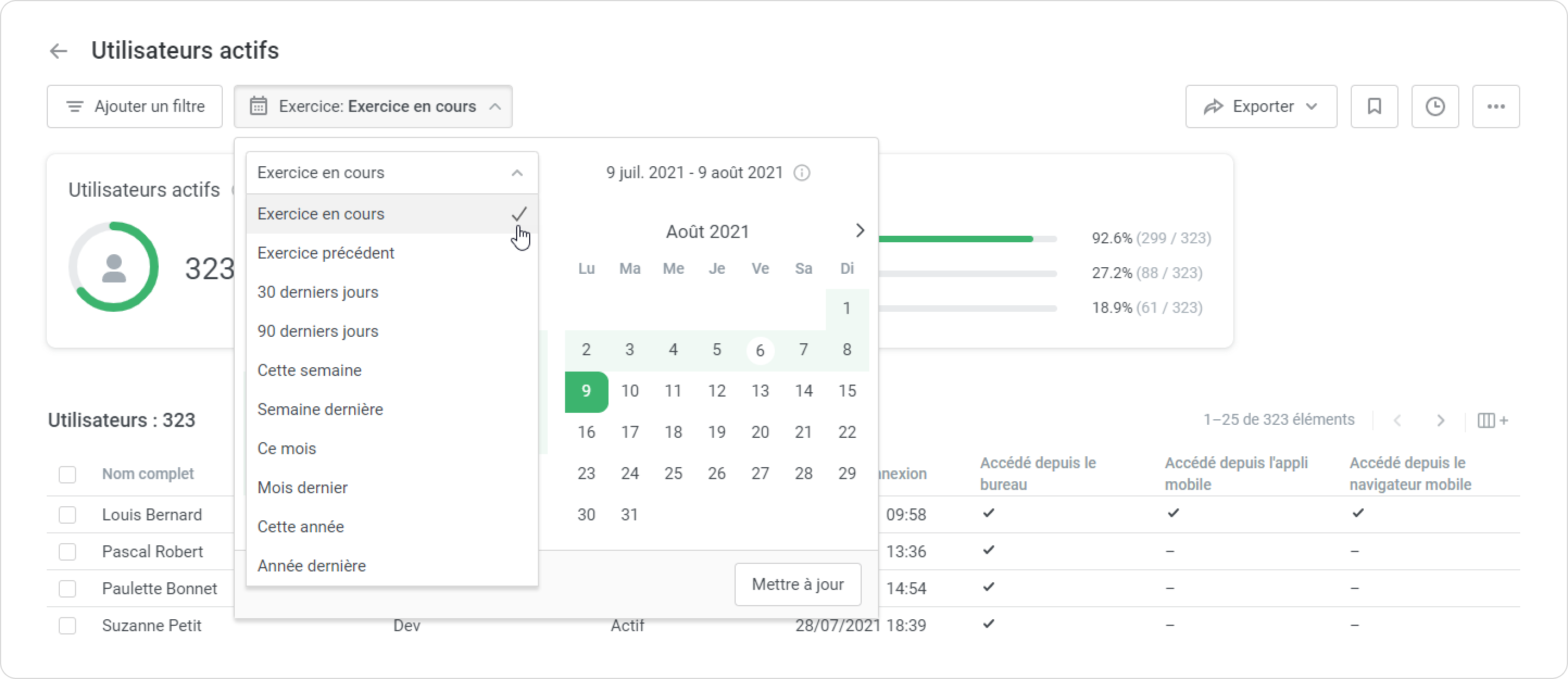 Cliquez sur Utilisateurs actifs. - Indiquez la période requise ou sélectionnez l'une des options de la liste déroulante de filtrage Période.