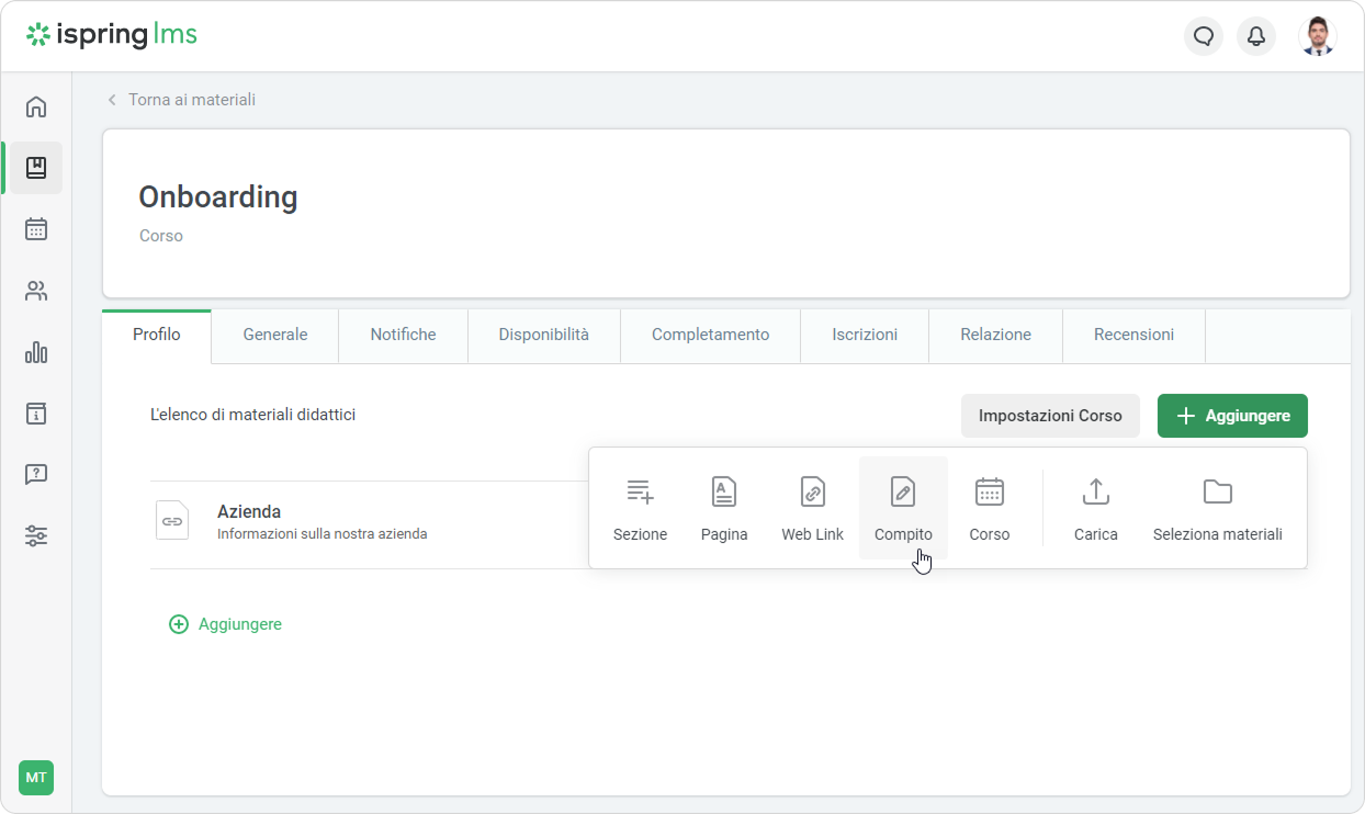 - Apri un corso, seleziona la scheda Profilo, fai clic su Aggiungere e scegli Compito.