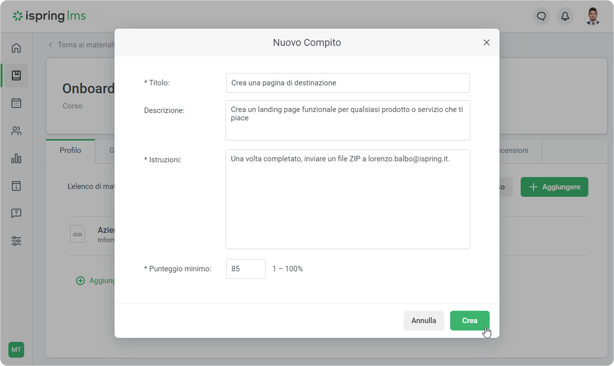 È tutto! Il compito viene aggiunto al corso e puoi gestirlo come qualsiasi altro contenuto.