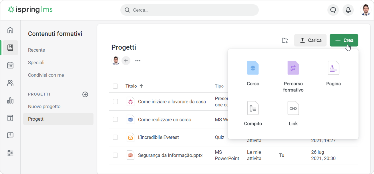 Puoi creare una pagina, un link oppure dei compiti autonomi all’interno del progetto. Apri il menu Crea e seleziona il tipo di contenuto di cui hai bisogno.