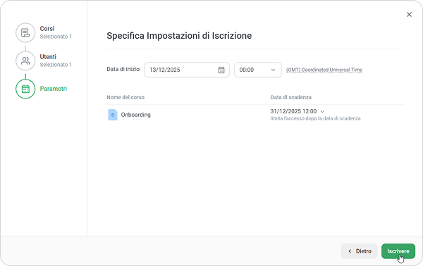 Il corso da assegnare verrà scelto nella finestra che si apre. Seleziona gli utenti che saranno iscritti al corso e vai al passaggio Parametri. In questo passaggio, puoi impostare la data e l’ora di inizio.