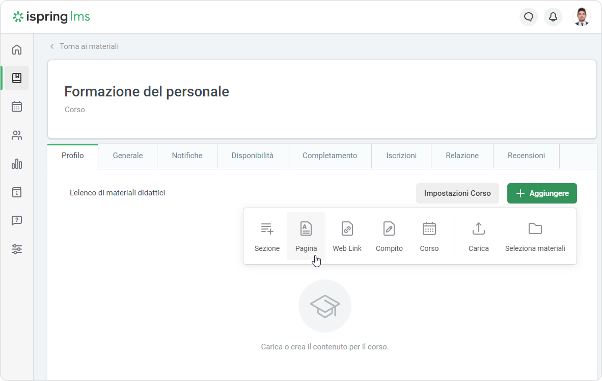 - Apri un corso, seleziona la scheda Profilo, fai clic su Aggiungere e scegli Pagina.