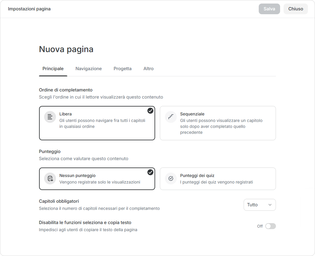 - Puoi anche controllare il modo in cui i tuoi studenti navigheranno il tuo corso scegliendo tra la modalità di navigazione Libera o Sequenziale.