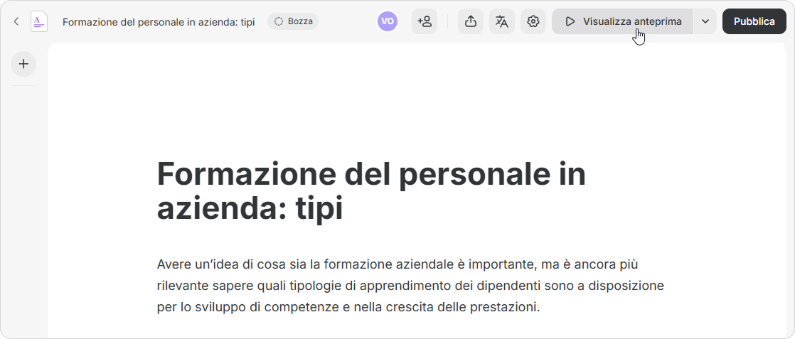 Inserisci il titolo, aggiungi i testi e le immagini, poi fai clic su "Pubblica". In alternativa, puoi copiare un articolo già pronto da qualsiasi altro documento, aggiungere delle immagini e dei video di YouTube/Vimeo e formattare il testo.