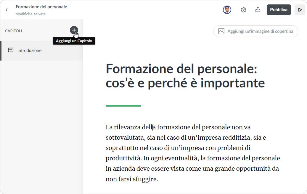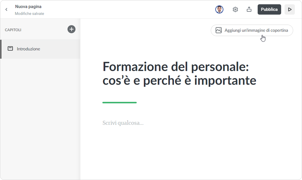 Per aggiungere un’immagine di copertina fai clic sul pulsante corrispondente nell’angolo in alto a destra. - Per praticità, abbiamo già inserito un modulo introduttivo. Procedi con la scrittura della parte principale oppure crea dei capitoli come in un libro per facilitare la lettura. Per farlo, fai clic su Aggiungi un capitolo.