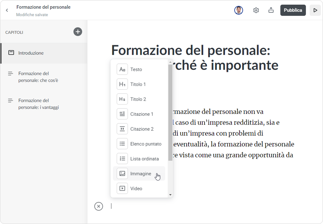 - Arricchisci il tuo corso con immagini, video, elenchi e citazioni premendo sul segno più e scegliendo la tipologia di contenuto adatta.