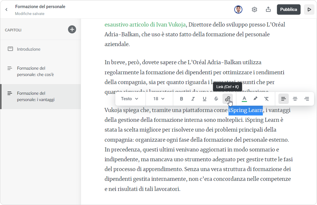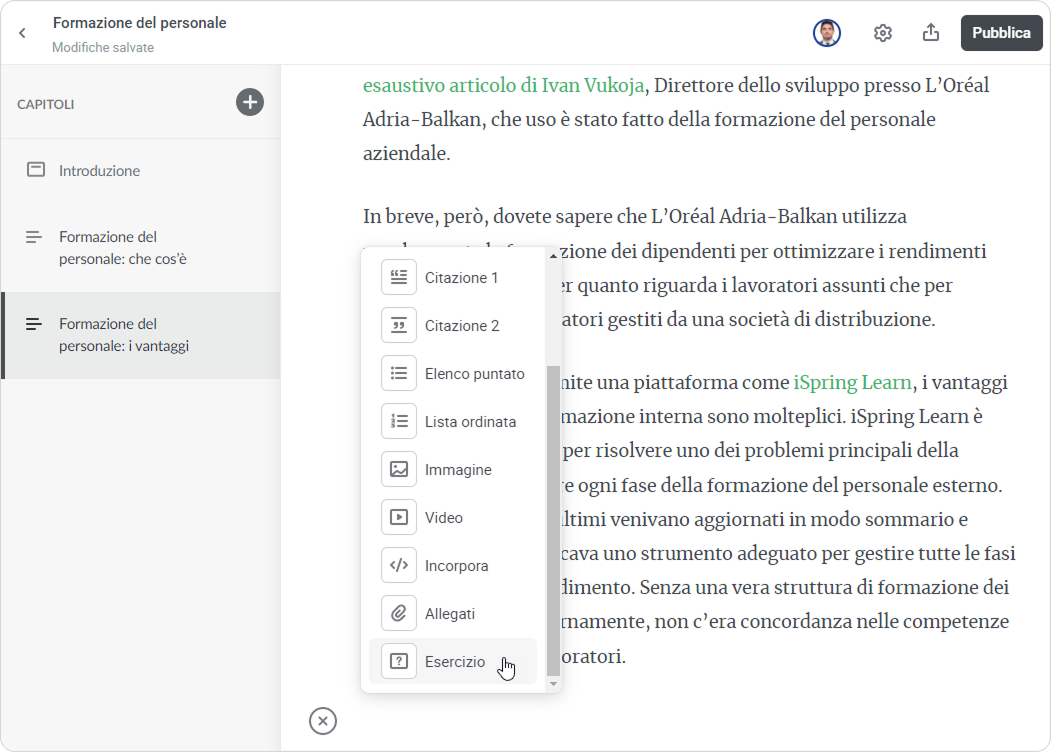 Puoi creare articoli con immagini, video, domande per la verifica della conoscenza e citazioni direttamente nel LMS.