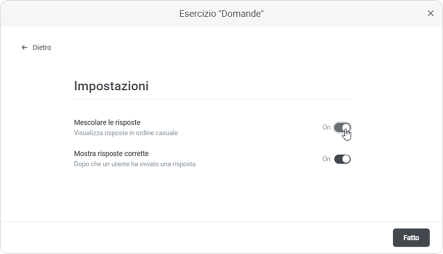 Per rendere il compito più impegnativo, puoi creare un ordine casuale delle risposte. Attiva l’opzione Mescolare le isposte nelle Impostazioni. - Puoi modificare l’aspetto e le modalità di interazione del tuo corso per adattarli alla tua identità aziendale. Applica semplicemente la combinazione di colori e il carattere desiderati.