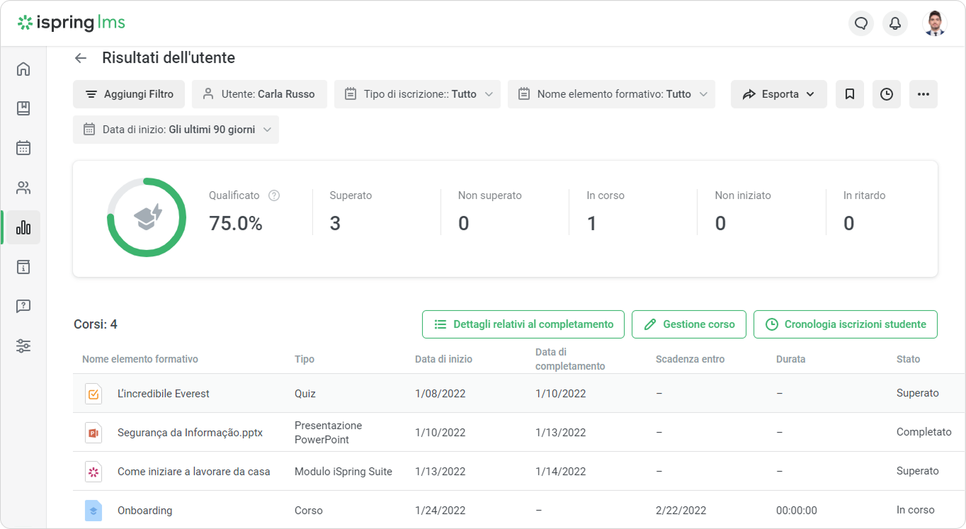Il report Risultati dell'utente è un modo facile e comodo per scoprire come un dato dipendente stia imparando nei corsi assegnati.