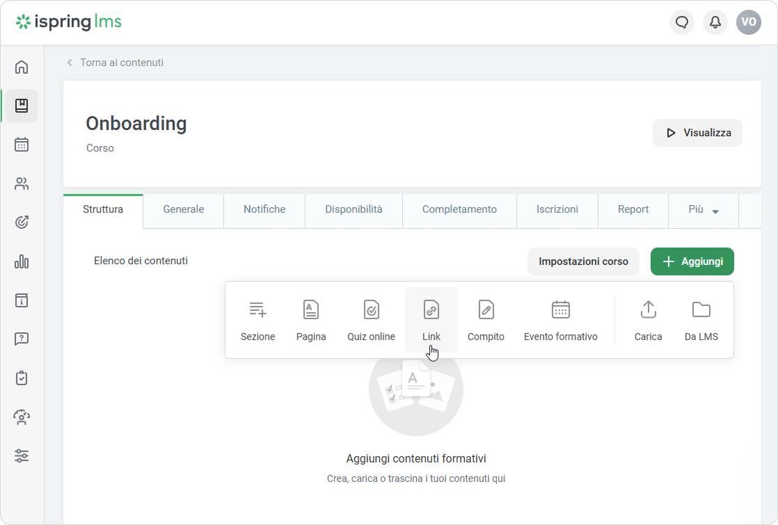 - Apri un corso, seleziona la scheda Struttura, fai clic su Aggiungi e scegli Link.