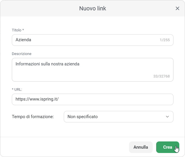 - Nella finestra Nuovo link digita il titolo del contenuto e inserisci il link nel campo URL. Poi, fai clic su Crea.