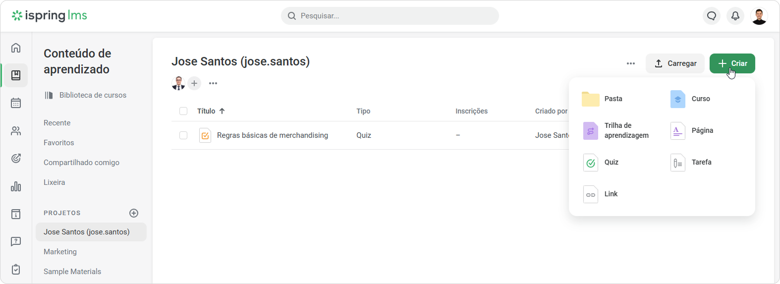 Você pode criar uma página independente, link, ou tarefa no projeto. Basta abrir o menu Criar e selecionar o tipo de conteúdo que você precisa.