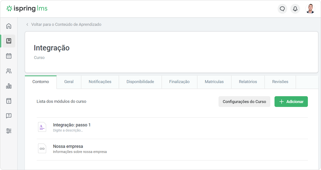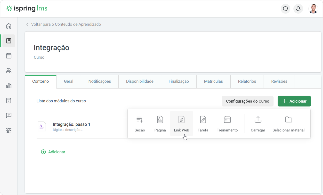 - Abra seu curso, selecione a aba Contorno, clique em Adicionar, e escolha Link Web.