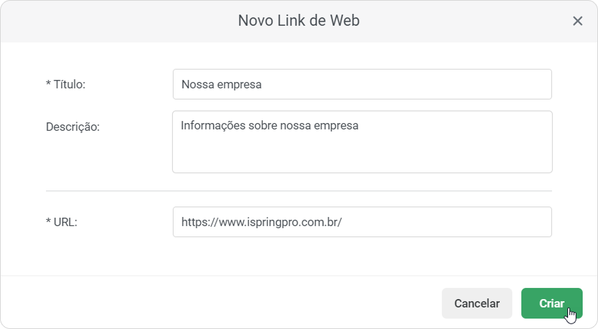 - Na janela Novo Link de Web , digite o título do conteúdo e insira o link no campo URL. Em seguida, clique em Criar.