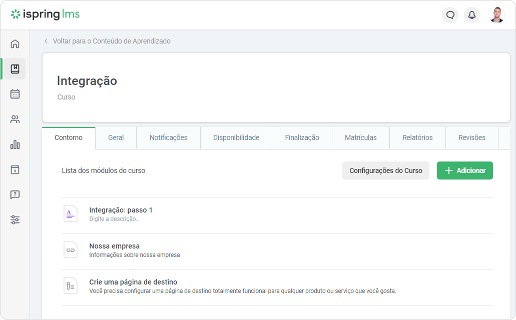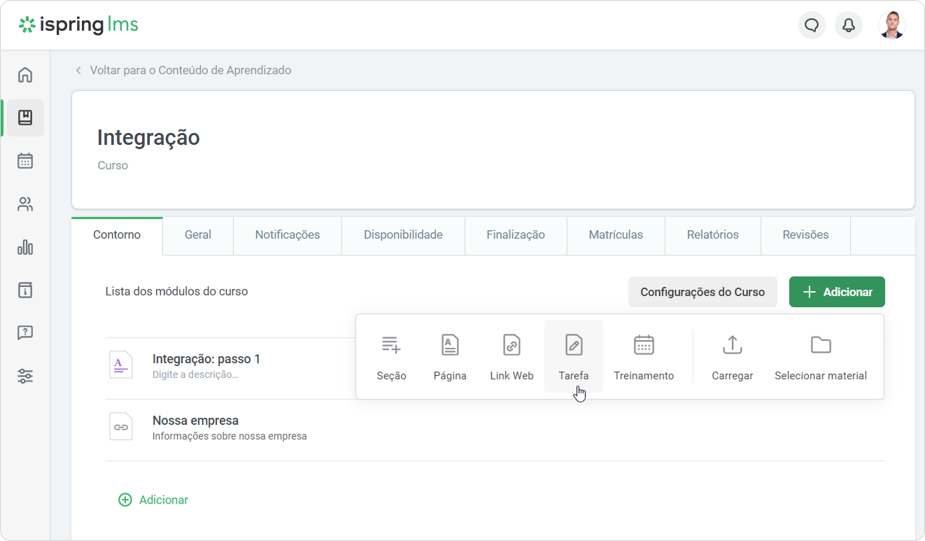 - Abra seu curso, selecione o Contorno, clique em Adicionar, e escolha Tarefa.