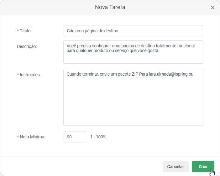 - Na janela Nova Tarefa, adicione o título, a descrição e as instruções da tarefa e defina a nota de aprovação. Clique no botão Criar.