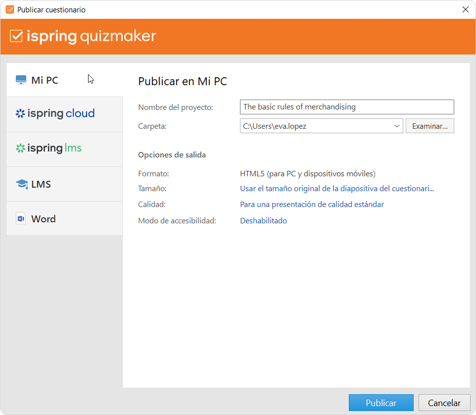Publica el cuestionario en tu cuenta de iSpring LMS.