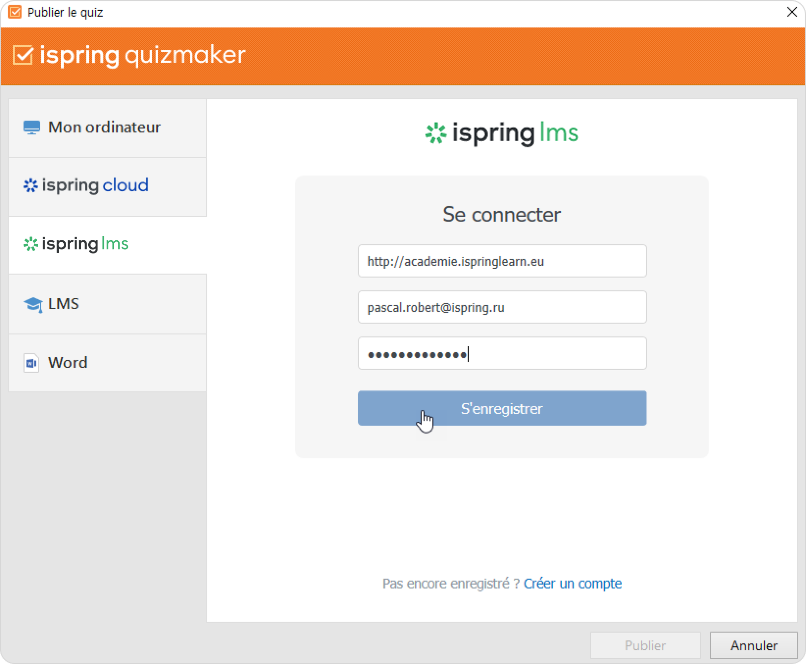 - Si vous êtes déjà inscrit, cliquez sur le lien Se connecter en bas de la fenêtre et saisissez votre adresse email et votre mot de passe pour votre compte iSpring LMS. Cliquez ensuite sur S'enregistrer. Les données spécifiées seront enregistrées dans iSpring QuizMaker, et vous n'aurez pas à les saisir à chaque fois.