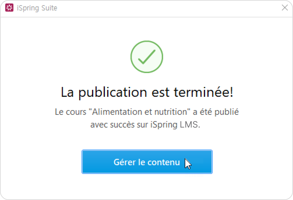 - Lorsque le processus de publication s’est bien terminé, une nouvelle fenêtre s'ouvre. Pour ouvrir le quiz publié dans l'interface iSpring LMS, cliquez sur Gérer le contenu.