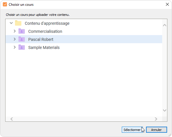 - Ensuite, cliquez sur Parcourir... à droite du champ Dossier et choisissez un cours dans lequel vous souhaitez uploader votre contenu. Après cela, cliquez sur Sélectionner.