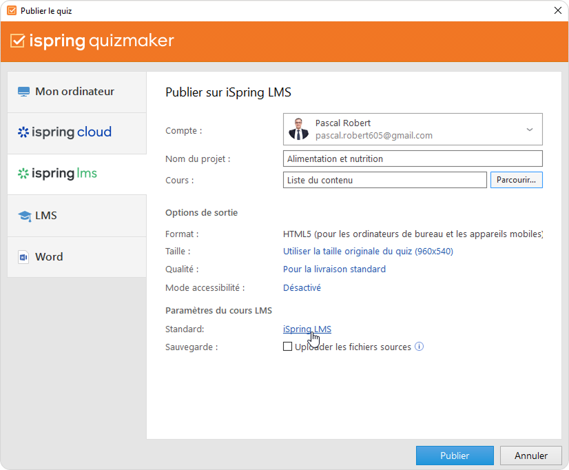 Pour publier votre quiz sur iSpring LMS :