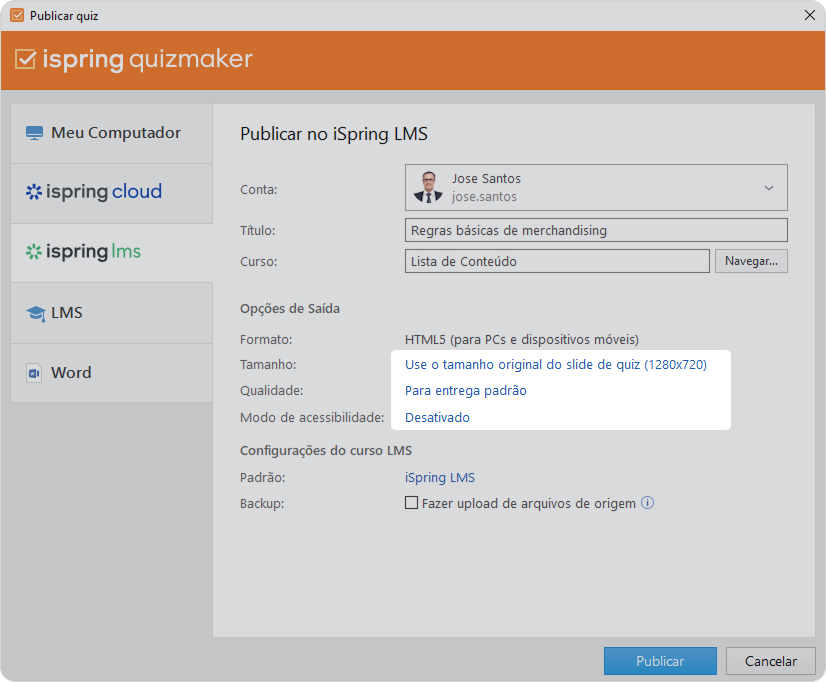 8. Clique no link iSpring LMS ao lado de Padrão para alterar as informações sobre o autor do conteúdo, etiquetas e descrição.