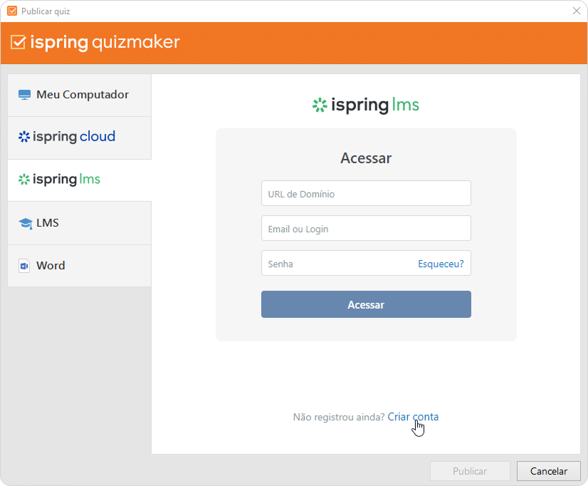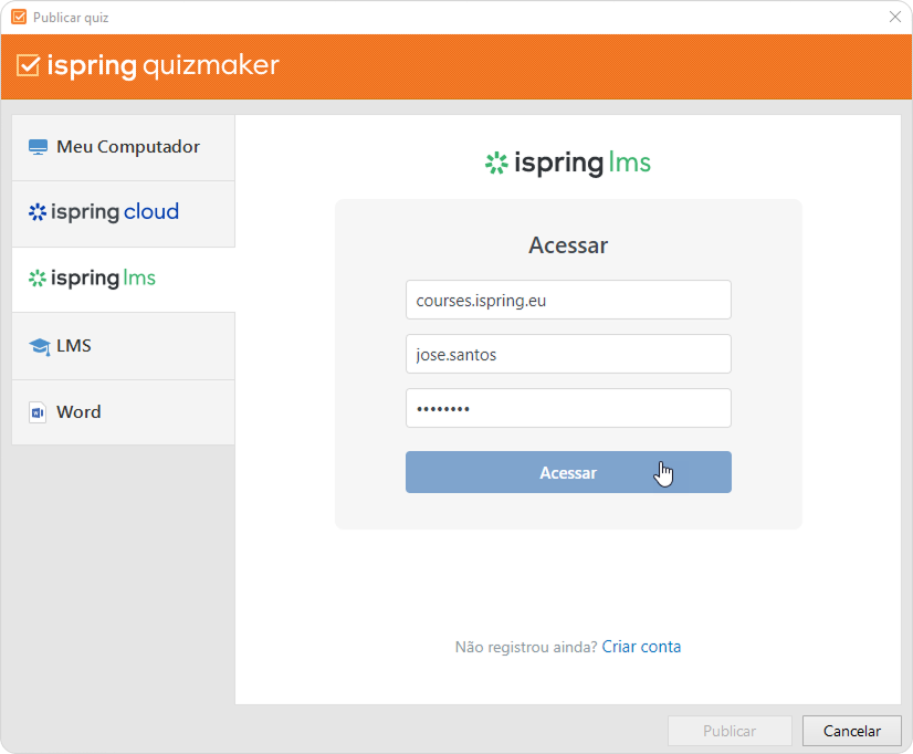 4. Se você já está registrado, clique no link Acessar na parte inferior da janela e digite seu e-mail e senha da sua conta do iSpring LMS. Em seguida, clique em Acessar. Os dados especificados serão salvos no iSpring QuizMaker e você não precisa inseri-los sempre.