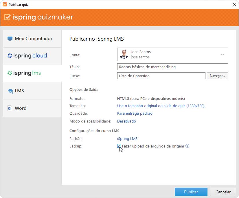 No campo Backup, selecione Fazer upload de arquivos de origem para que você e seus administradores possam baixar os arquivos de origem do teste no iSpring LMS.
