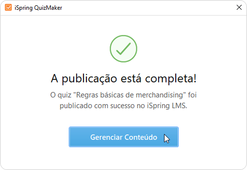 10. Quando o processo de publicação for concluído com sucesso, uma nova janela será aberta. Para abrir o quiz publicado na interface do iSpring LMS, clique em Gerenciar conteúdo.