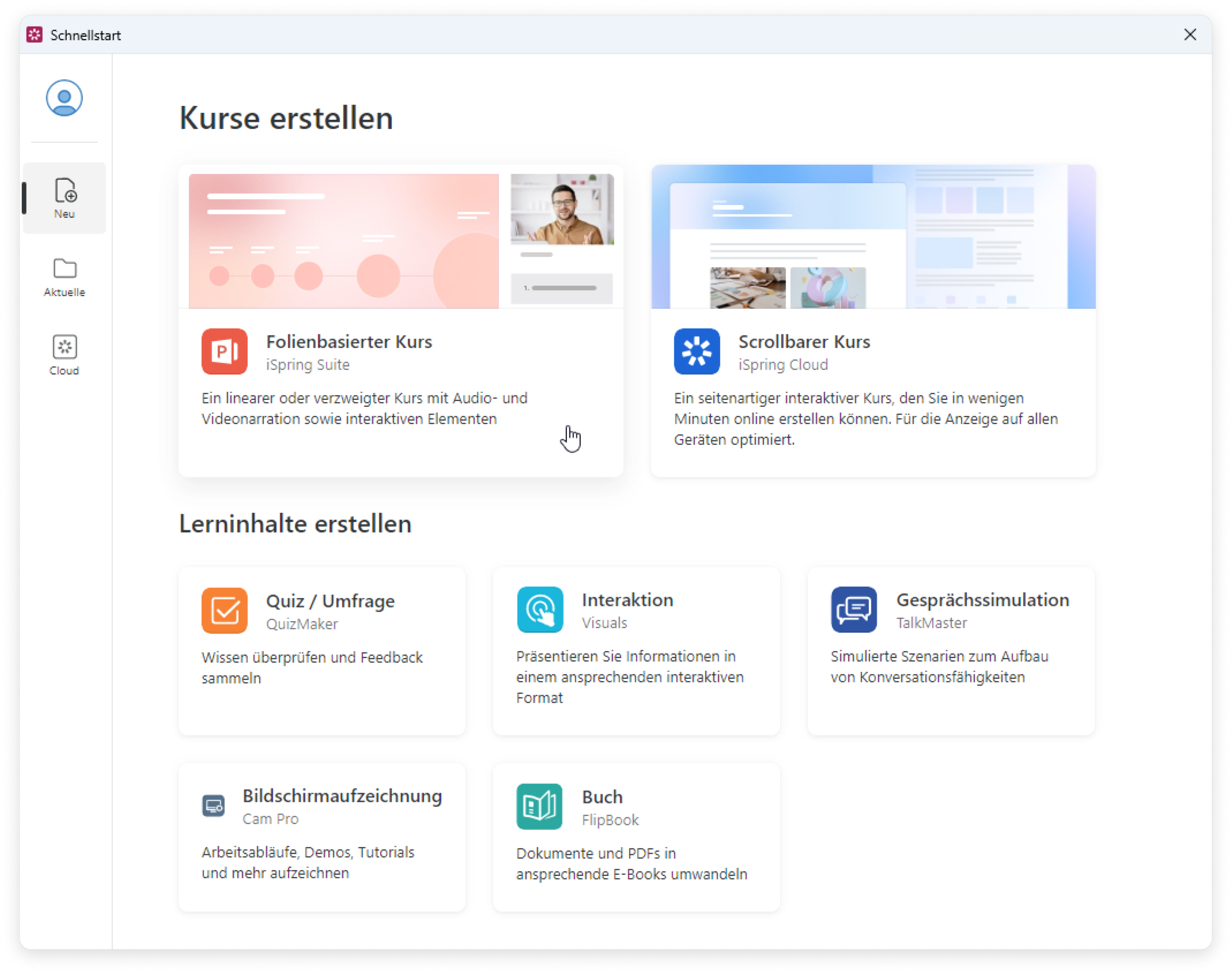 - Entwickeln Sie einen Kurs mit den Optionen der iSpring Suite: