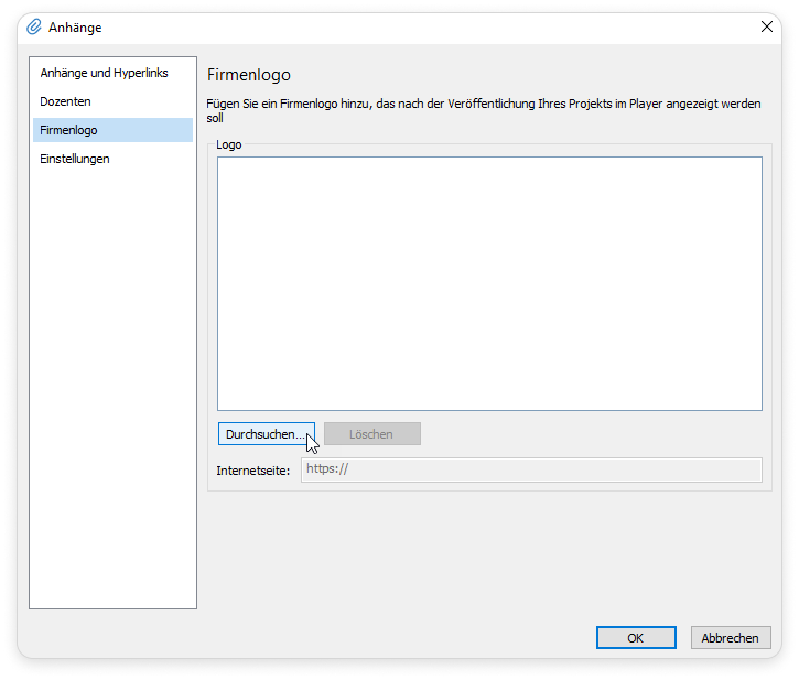 - Wählen Sie im Fenster Anhänge die Registerkarte Firmenlogo und klicken Sie auf Durchsuchen.
