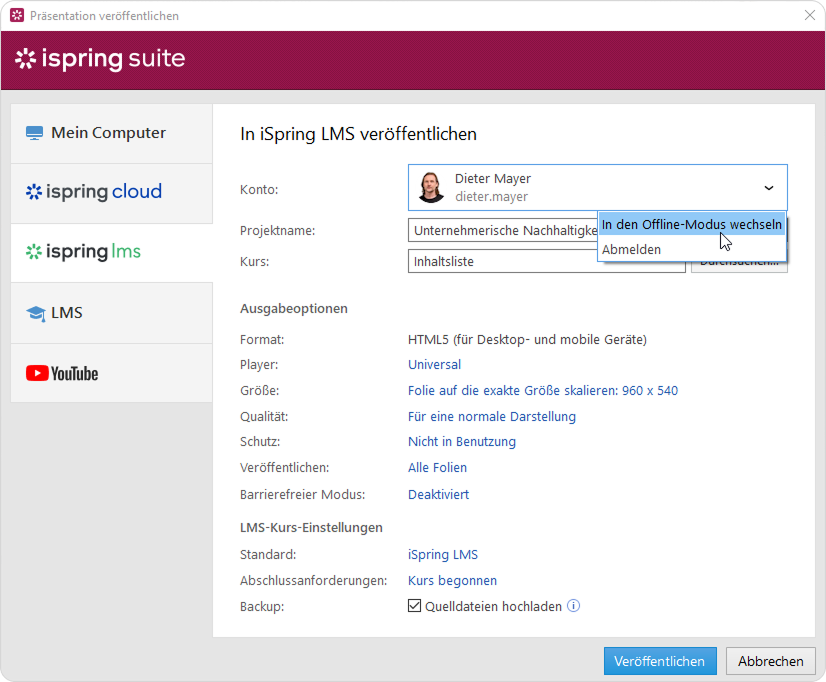 iSpring Suite erstellt ein Paket, das zum Hochladen auf iSpring Suite bereit ist. Jetzt können Sie sich jederzeit in Ihr iSpring Suite-Konto einloggen und dieses Paket in einen Kurs hochladen. Um mehr zu erfahren, lesen Sie die detaillierte Anleitung zum Hochladen von Inhalten über das Webinterface.