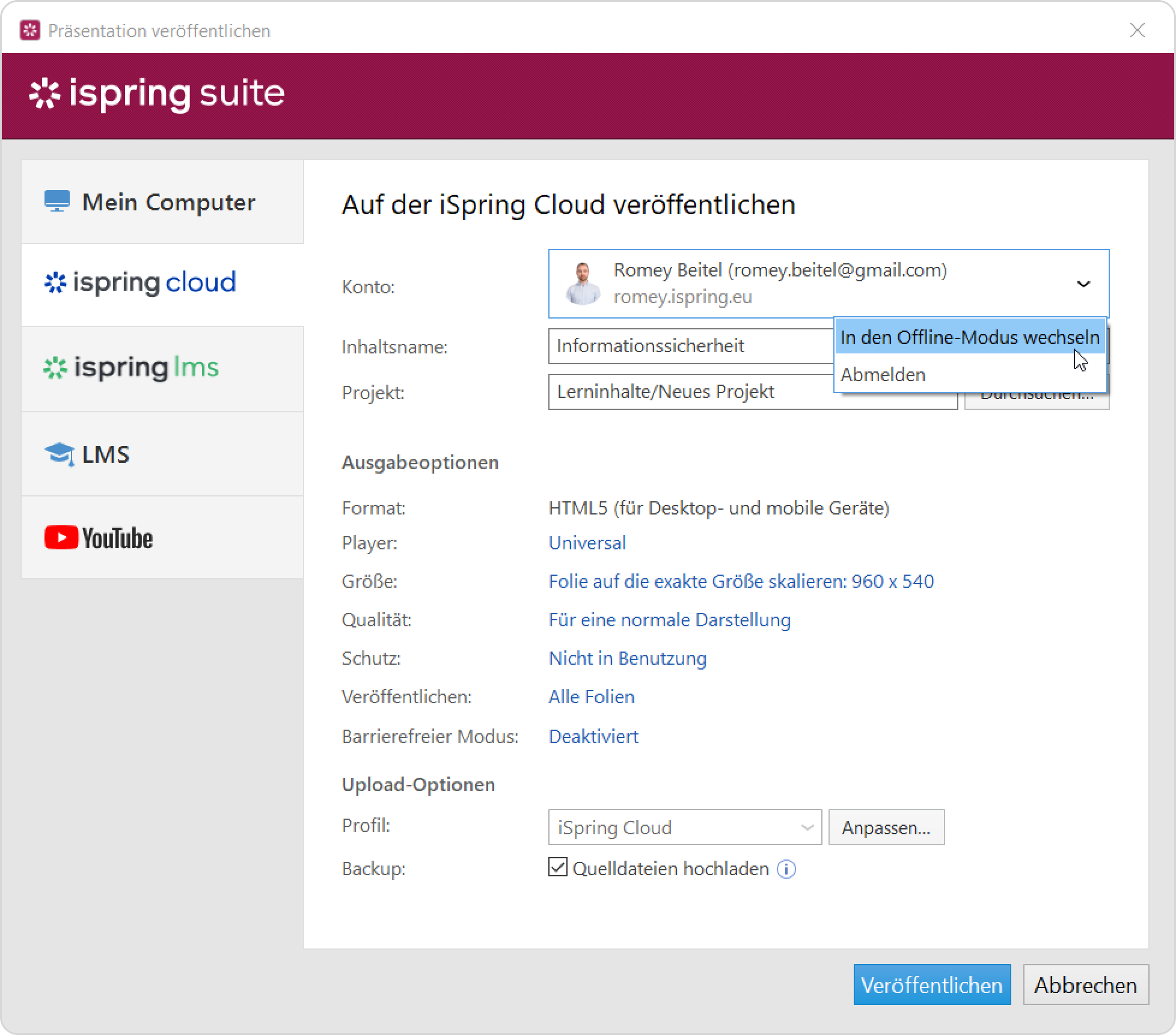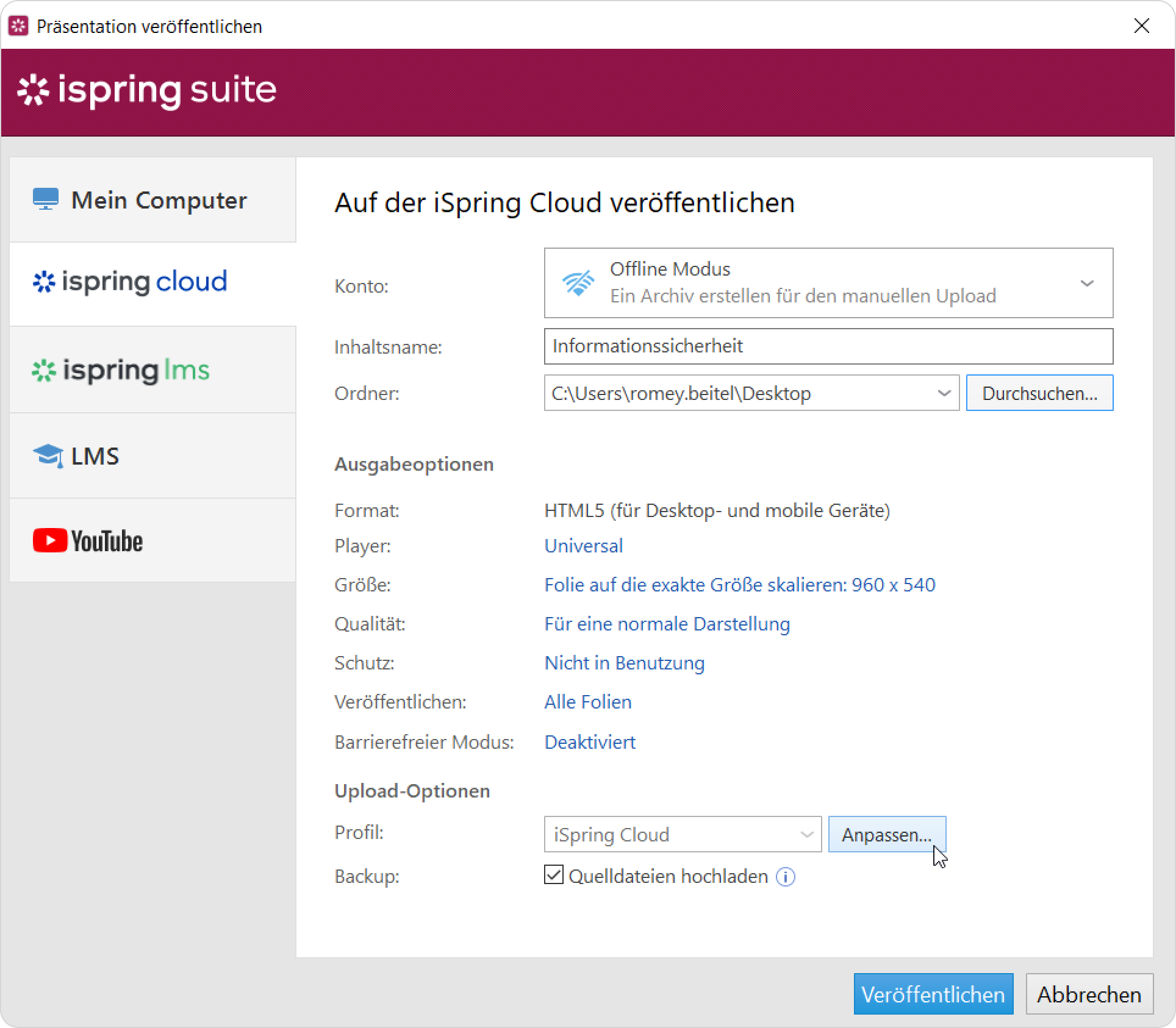 Wenn Ihr Computer vom Internet getrennt ist oder die Online-Veröffentlichung aufgrund eines Antivirenprogramms oder eines Proxy-Serverfehlers nicht abgeschlossen ist, können Sie den Kurs manuell auf iSpring Cloud hochladen.