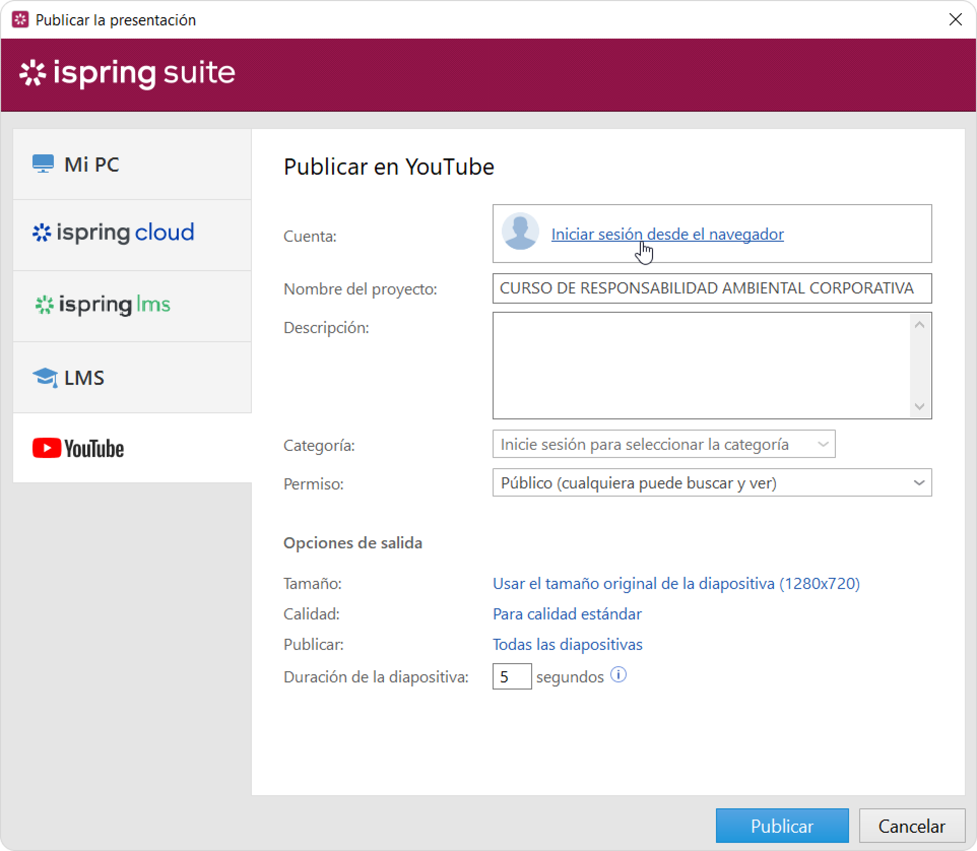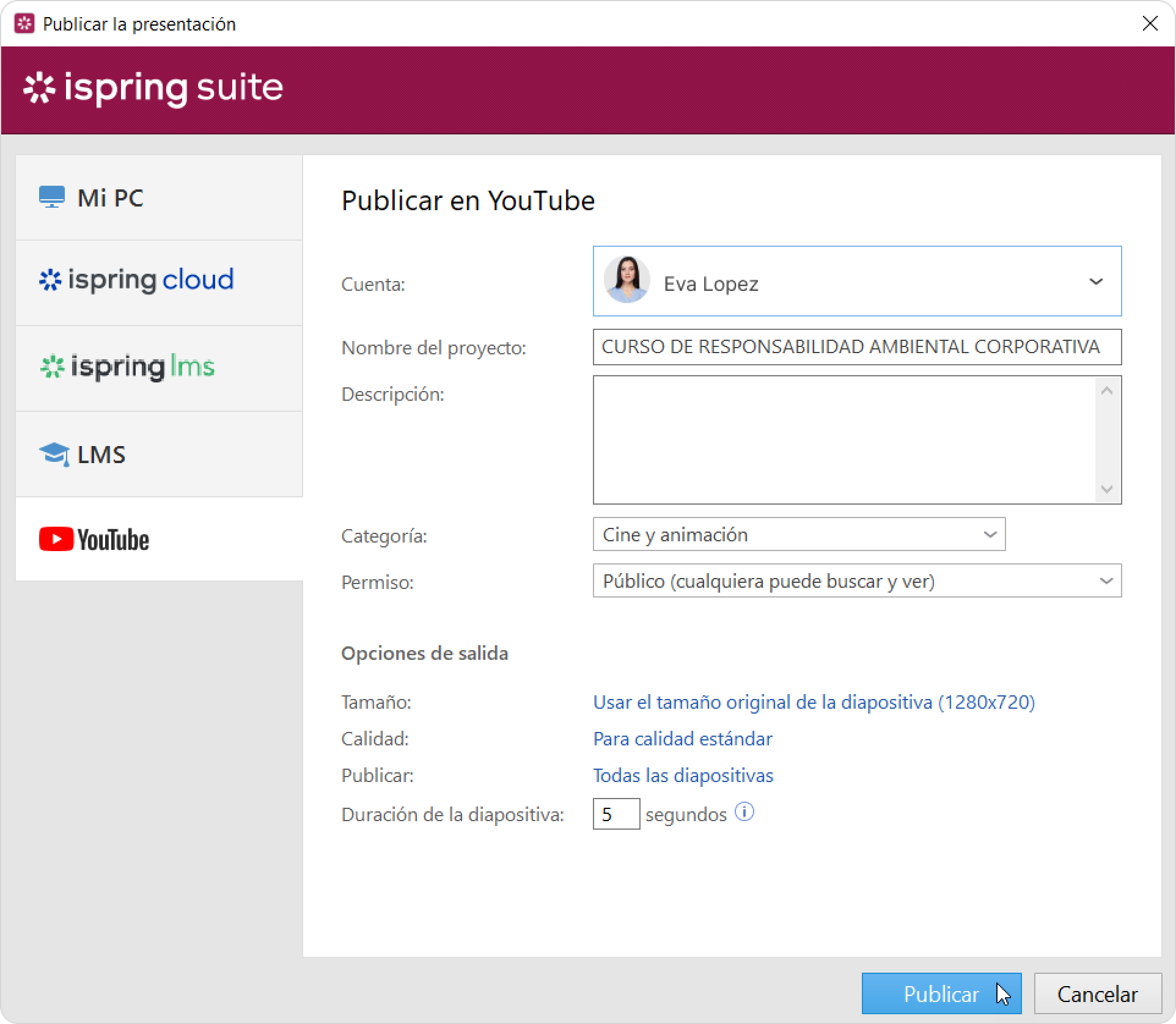 5. Después de iniciar sesión, iSpring verificará la información de tu cuenta de YouTube y, si has introducido correctamente tus datos de inicio de sesión, verás la información de la cuenta en el campo Cuenta. La información se guardará en el sistema, por lo que no tendrás que volver a introducirla la próxima vez.
